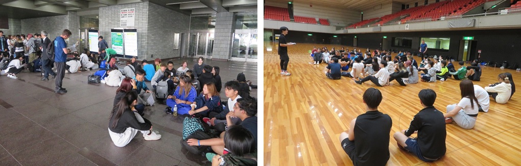 エディオンアリーナの玄関口ではチーム内で自己紹介。普段はあまり関わることのない学年の生徒同士、良い雰囲気でスタートしました。