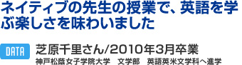 先生方は、生徒に対してとても協力的で授業に対する質問や進路を含め、親身になっていろいろな相談事にのってくれる方々ばかりだったので、私たち生徒は先生方をお母さんやお父さんのように慕っていました。また、ネイティブの先生方は陽気な方が多く、私たちは友達のように親しく接することができたので授業中はもちろん、休憩時間中でもネイティブの先生方とよく話をしました。こんな環境だったので、自然に英語に親しみ、学ぶことができたのだと思います。